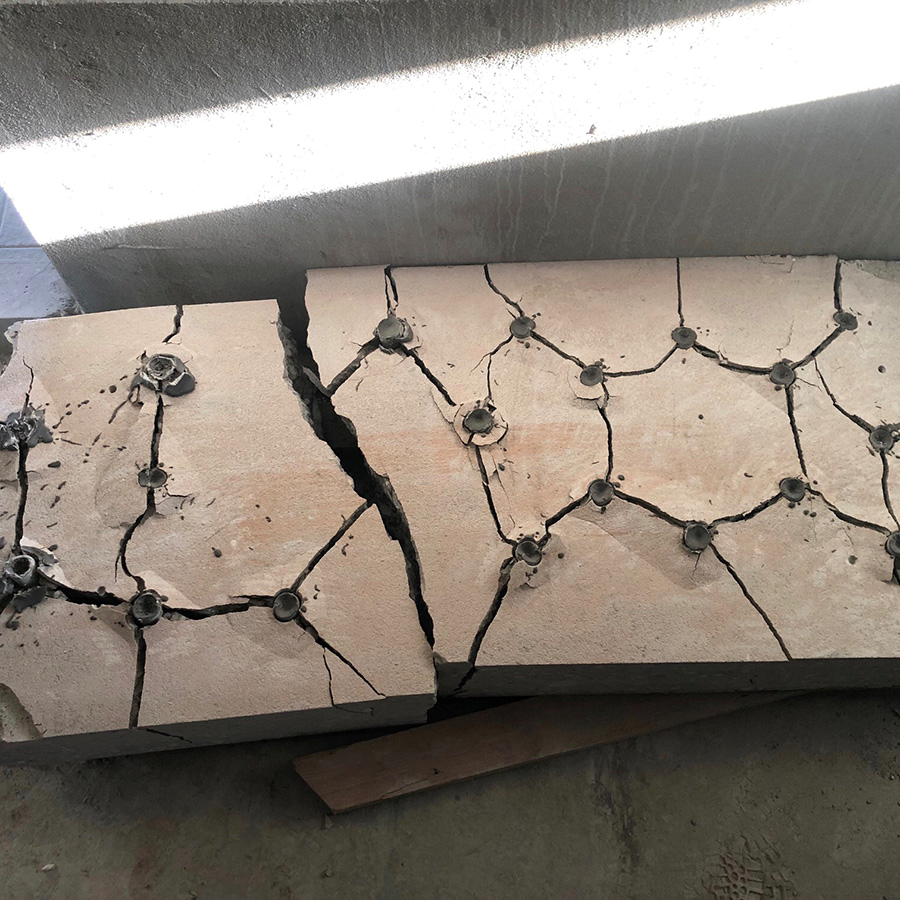 Das Gemisch härtet nun aus und beginnt langsam in den Bohrlöchern einen Expansionsdruck aufzubauen, bis der Stein oder Beton nachgibt und auseinanderbricht. Der Vorgang dauert ja nach Temperatur zwischen 4 und 96 Stunden.